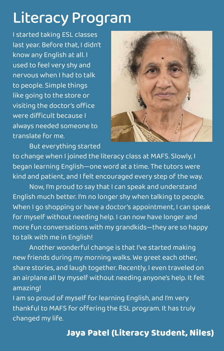 MAFS provides multilingual support to ensure access for diverse communities. Services and materials may be available in languages such as English, Hindi, Urdu, Gujarati, Bengali, Punjabi, Spanish, and others depending on the program.